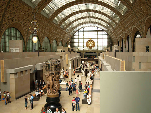 進去之後經由導遊的解說, 知道奧賽美術館的舊址原本是騎兵營和奧賽宮(Palais d'Orsay), 於1871年巴黎公社中燒毀後於1900年改建為車站, 在經過多年使用後由於車站太小和鐵軌太窄, 最後廢棄,後來因為羅浮宮展覽品過多以及巴黎缺少一個收藏19世紀藝術家作品的展場, 因而選定奧賽火車站改建為奧塞美術館, 於1978年動工, 在1986年完成並對外開放。目前一共有四千多件藝術品收集在這裡。 在這個時期(1848-1911)一方面法國處於國家動盪不安, 一方面由於攝影技術的發明, 衝擊到繪畫在本質上的思維, 因此產生了許多被後世稱為印象派的畫家, 如我們所熟知的梵谷, 高更, 賽尚,以及雕塑家羅丹等人的部分作品都被收藏在這裡, 其中也包括了野獸派的馬蒂斯和抽象派的畢卡索的作品在內